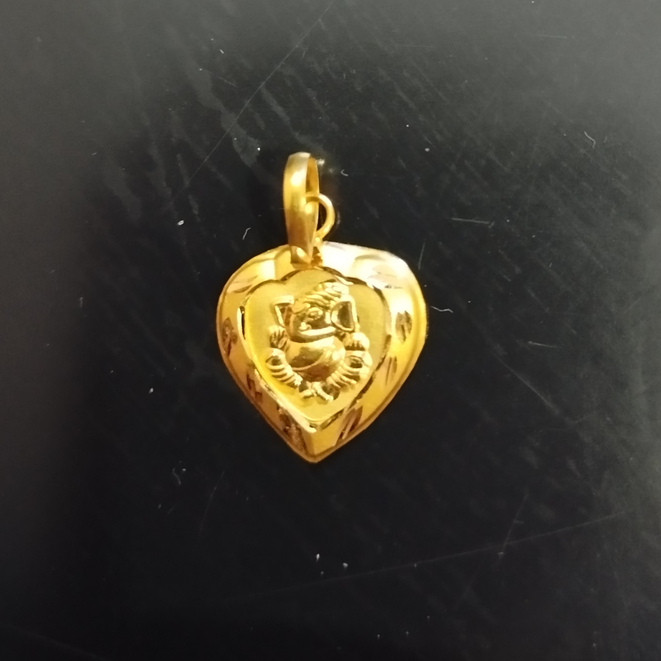 A beautifully crafted heart-shaped gold pendant featuring Lord Ganesha, symbolizing love, protection, and prosperity. Celebrate faith and affection with this elegant Divine Ganesha Heart Gold Pendant. Designed in a graceful heart shape, the pendant beautifully showcases a finely detailed image of Lord Ganesha at its center—known as the remover of obstacles and the harbinger of good fortune. The smooth polished finish combined with subtle design accents enhances its charm, making it a perfect blend of spirituality and style. Ideal for daily wear or special occasions, this pendant adds a meaningful touch to your jewellery collection. It also makes a thoughtful and auspicious gift for loved ones. 💛 Highlights: Heart-shaped elegant design Intricate Lord Ganesha detailing Symbol of love, blessings & prosperity Smooth and glossy gold finish Lightweight & comfortable for everyday wear Perfect for gifting on special occasions
