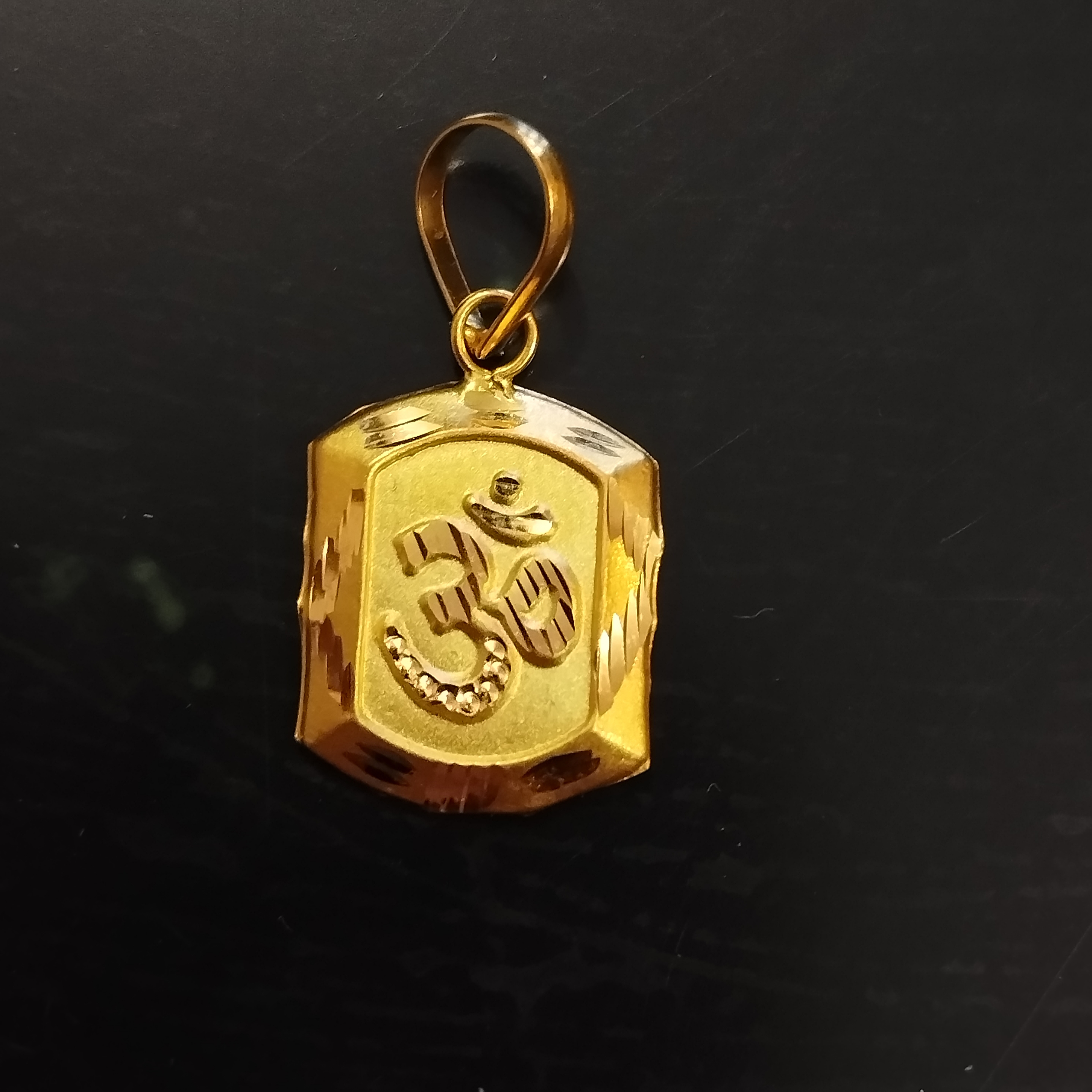 Beautifully crafted gold pendant featuring the sacred “Om” symbol with artistic detailing, representing peace, positivity, and divine blessings.