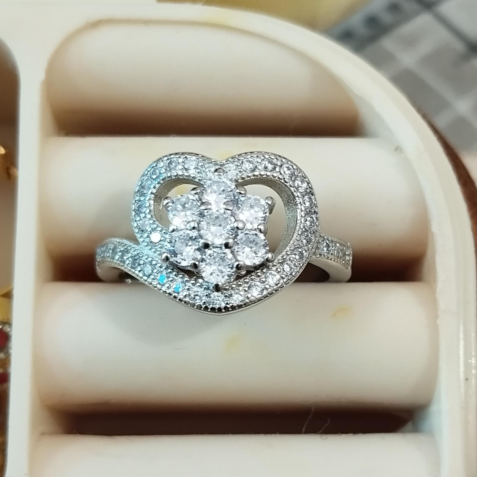 Romantic and radiant, the Eternal Heart Bloom Silver Ring is crafted in 925 sterling silver and features a graceful heart silhouette adorned with shimmering premium stones, centered with a sparkling floral cluster. A beautiful symbol of love and elegance, this ring blends delicate craftsmanship with eye-catching brilliance—perfect for gifting or adding charm to your collection. Highlights: • Crafted in 925 Sterling Silver • Heart-shaped design with floral stone cluster • Studded with sparkling premium stones • Symbolic design representing love and beauty • Elegant, lightweight and comfortable to wear • Perfect for gifting, special occasions and daily elegance