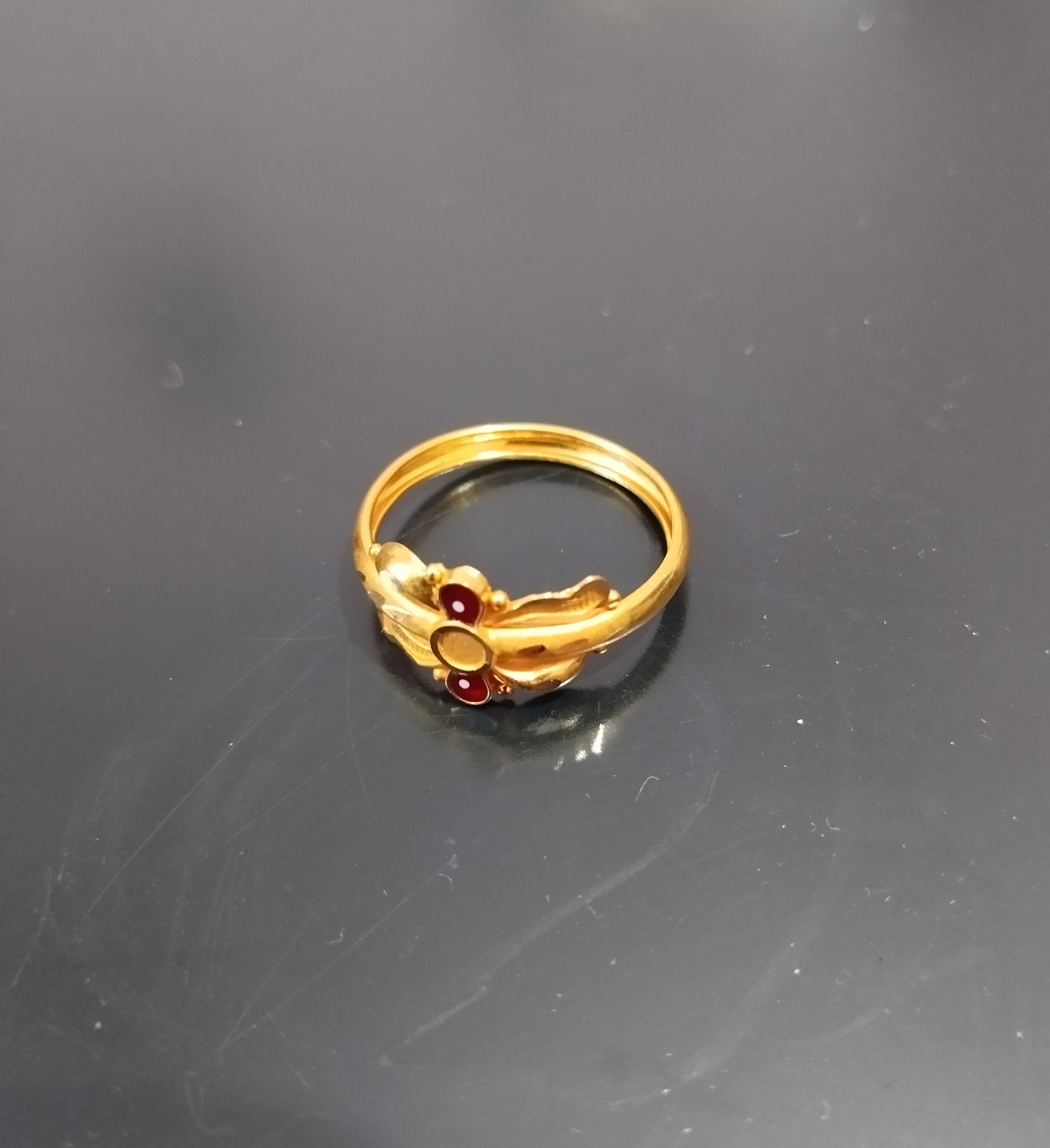A beautifully crafted gold ring featuring a graceful leaf-inspired design, accented with delicate red stone highlights. The flowing curves and smooth finish give it a soft, elegant appeal, making it perfect for everyday wear as well as special occasions. Its minimal yet artistic design adds a touch of traditional charm with a modern twist. Highlights: - Elegant leaf motif design - Studded with vibrant red meena for a subtle pop of color - Smooth, polished gold finish for a premium look - Ultra Lightweight and comfortable for daily wear - Perfect blend of tradition and simplicity - Ideal for gifting or personal styling