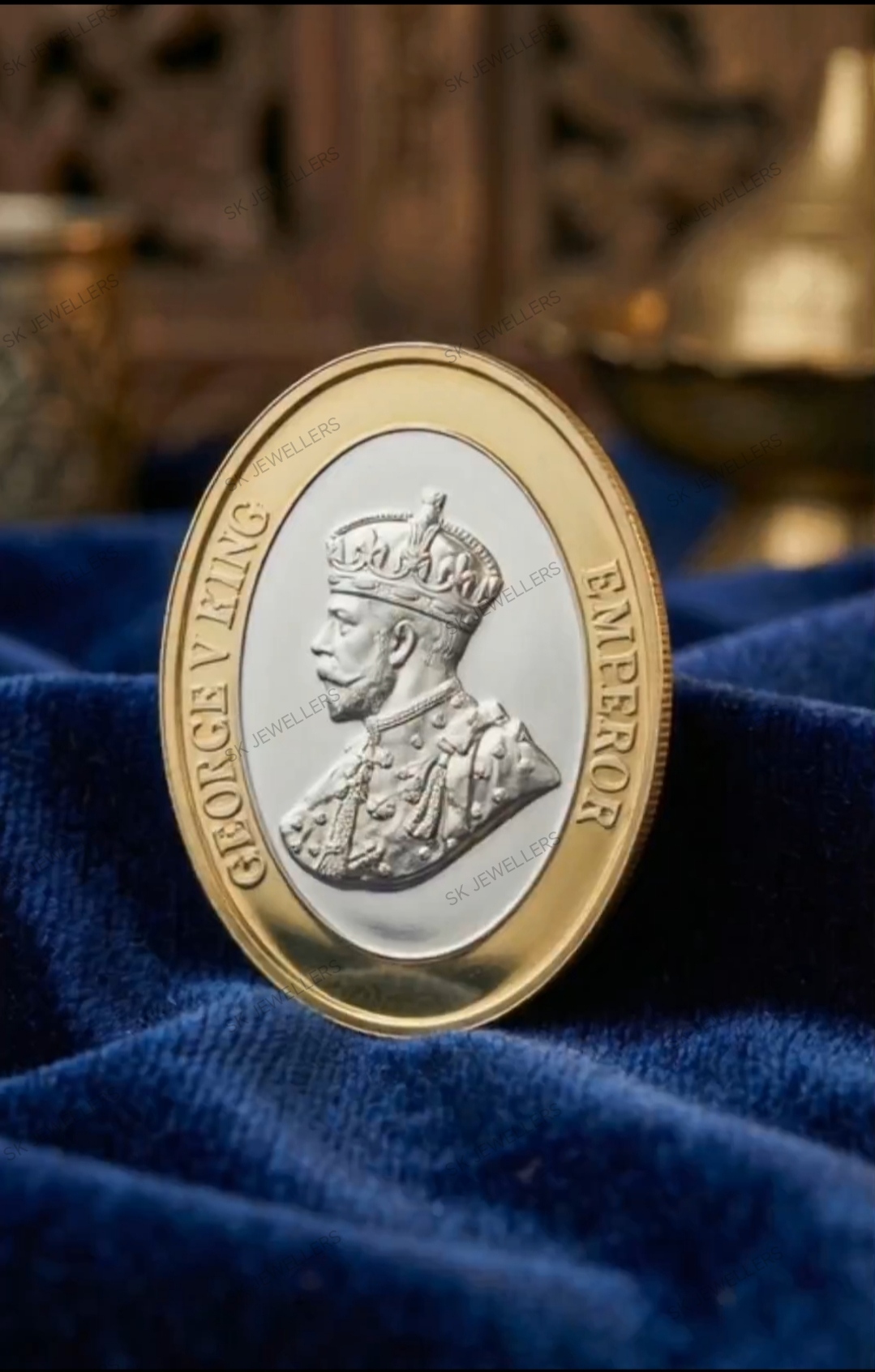 A finely crafted 20 gm pure 999 silver coin with Golden edges featuring a classic King George design—perfect for gifting, collection, and investment. Key Features: - Purity: 999 Fine Silver (99.9% pure) - Weight: 20 grams - Premium Silver and Gold finish with detailed engraving - Ideal for gifting, collection & investment Durable and long-lasting shine - Lifetime exchange against Silver Jewellery without any deduction