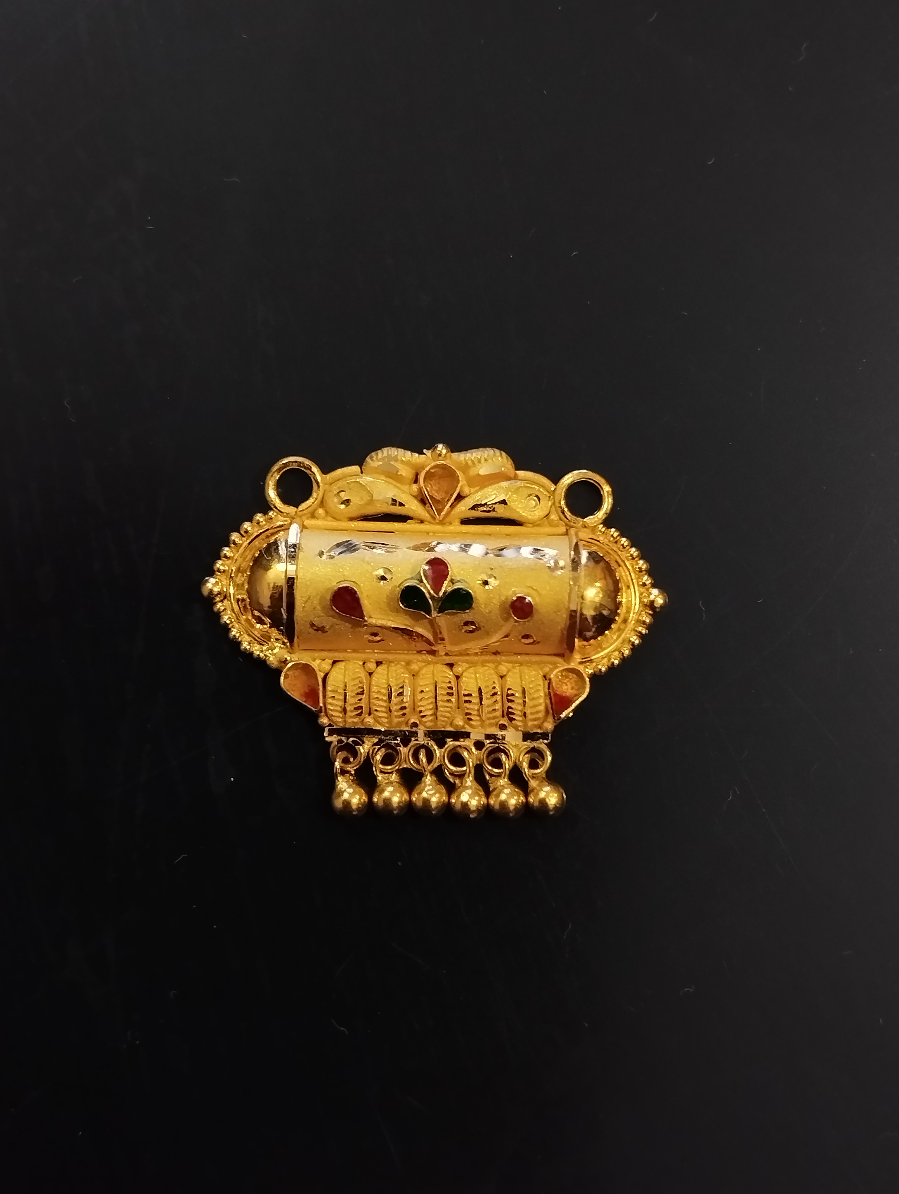 A beautifully crafted gold pendant featuring traditional meenakari work with elegant hanging beads, inspired by royal heritage designs. Celebrate timeless tradition with this exquisite Rajwadi Meenakari Pendant. Designed with intricate detailing, this pendant showcases a cylindrical centerpiece adorned with vibrant meenakari work in rich red and green tones. The antique-inspired gold framework adds a royal touch, while the delicate hanging ghungroo-style beads enhance its ethnic charm. The artistic blend of classic craftsmanship and cultural elegance makes this pendant a perfect choice for festive occasions, weddings, and traditional wear. Its unique design stands out beautifully, making it a statement piece in any jewellery collection. 💛 Highlights: - Traditional meenakari enamel work - Royal Rajwadi-inspired design - Elegant hanging bead (ghungroo) detailing - Rich gold finish with intricate craftsmanship - Ideal for festive & wedding wear - Perfect statement jewellery piece